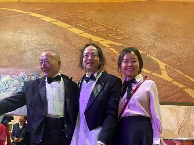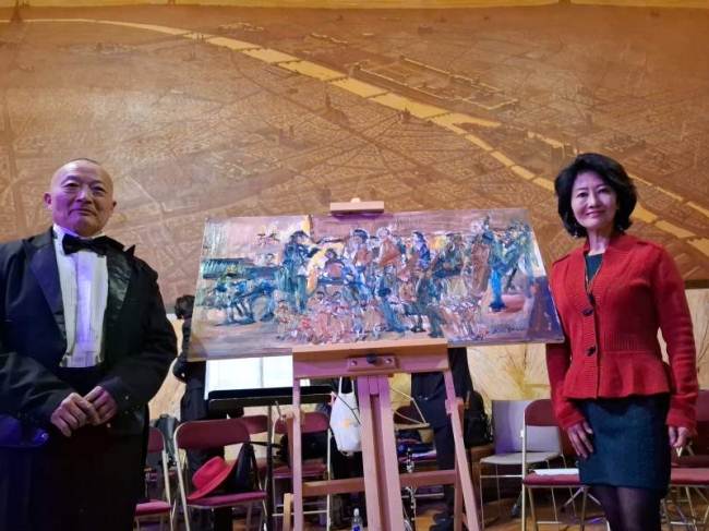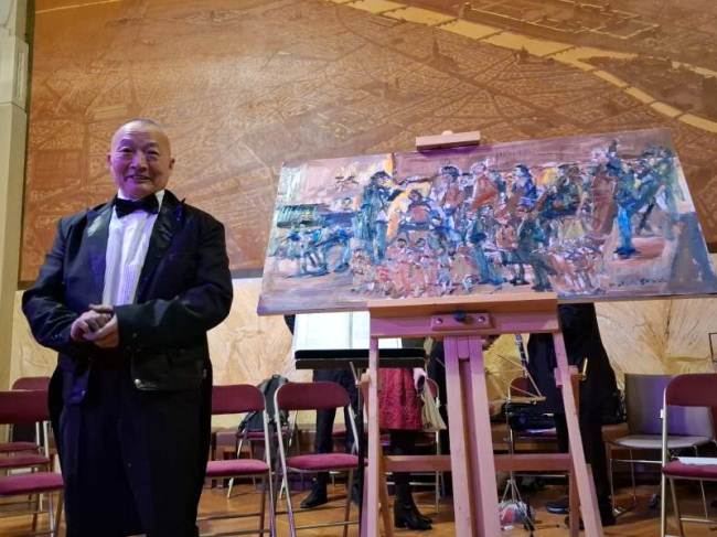 旅法艺术家沈斯先生在台前现场作画,一幅表现中西方音乐与美术结合的油画,栩栩如生,最后展现于观众面前